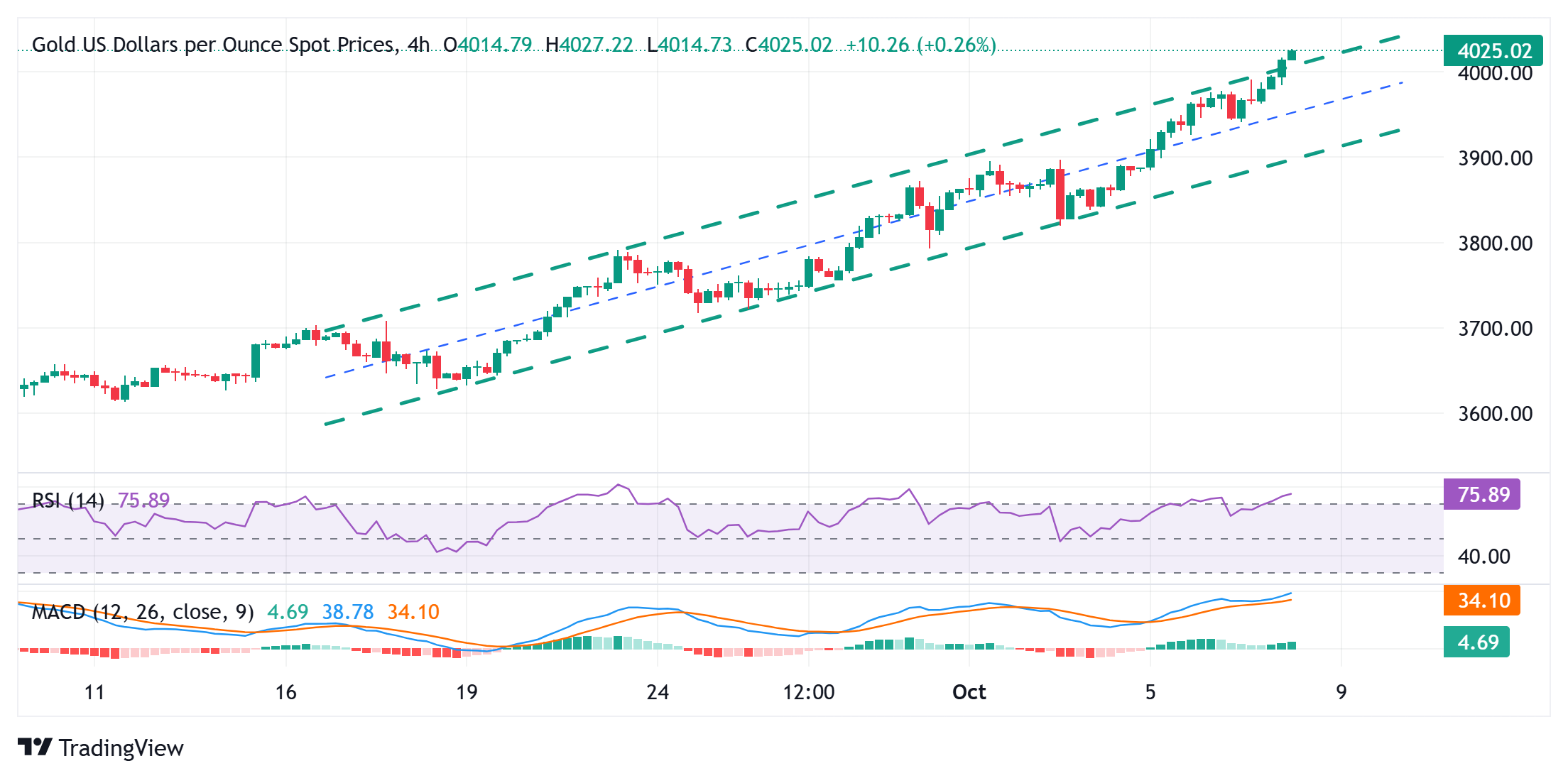 黄金(XAU/USD)在周三欧洲时段的前半段继续创下新高,并在过去一小时攀升至 4040 美元区域。美国联邦储备委员会(Fed)进一步降息的日益接受是推动资金流向这种无收益的黄金的重要因素。此外,关于美国政府长期停摆可能影响经济表现的担忧加剧,成為支撑避险黄金的另一个因素,侭管全球风险情绪略有恶化。