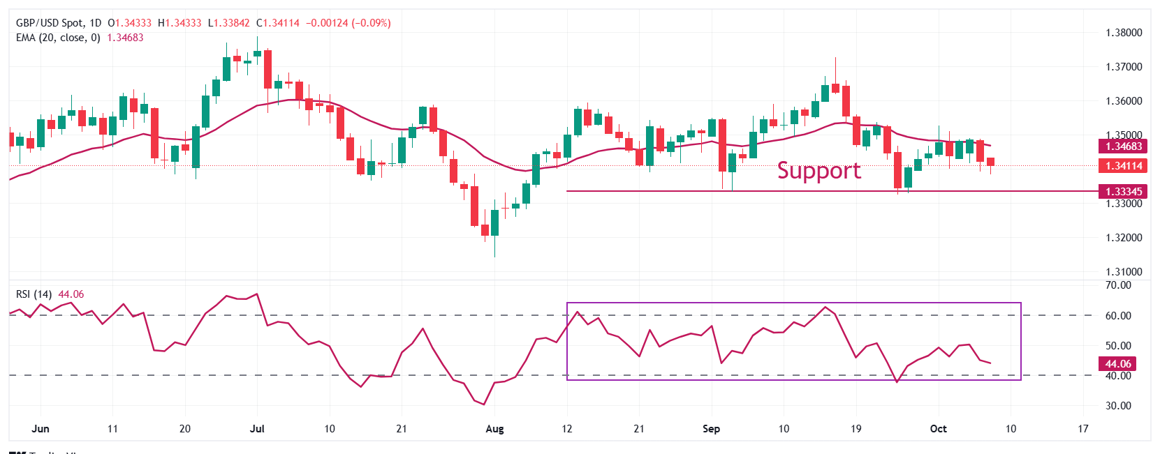 周三,英镑兑美元表现不佳,跌至接近1.3400。英镑/美元对仍低于20日指数移动平均缐(EMA),该均缐交易在1.3468附近,表明短期趋势看跌。