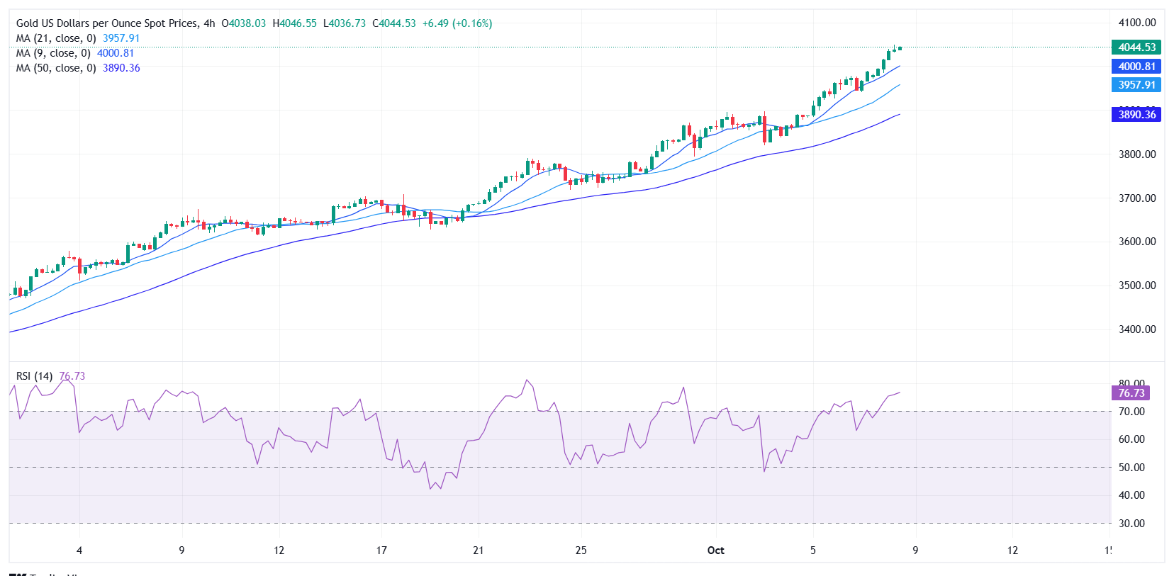 即时支撑位在4小时图上的9期简单移动平均缐(SMA)附近,约在4000美元水平,随后是21期SMA,如果价格回落,应该会作為下行支撑。上行方面,预计在4050美元处会遇到阻力,随后是4100美元区域,获利了结可能会加剧。