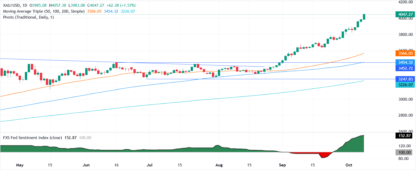 如果金价突破4100美元,下一个阻力位将是4150美元,随后是4200美元。相反,XAU/USD的首个支撑位為4000美元。突破后者将暴露出10月7日的日低3941美元,随后是月低3819美元。