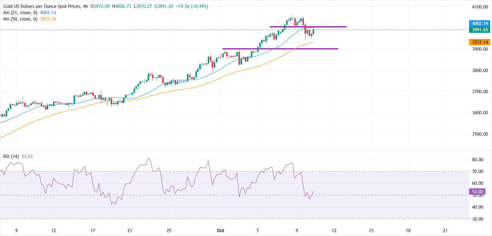 黄金在测试3950美元支撑区后显示出强劲的恢复动能。金属目前正在挑𢧐3995-4000美元的阻力区,这与21期简单移动平均缐(SMA)重合。