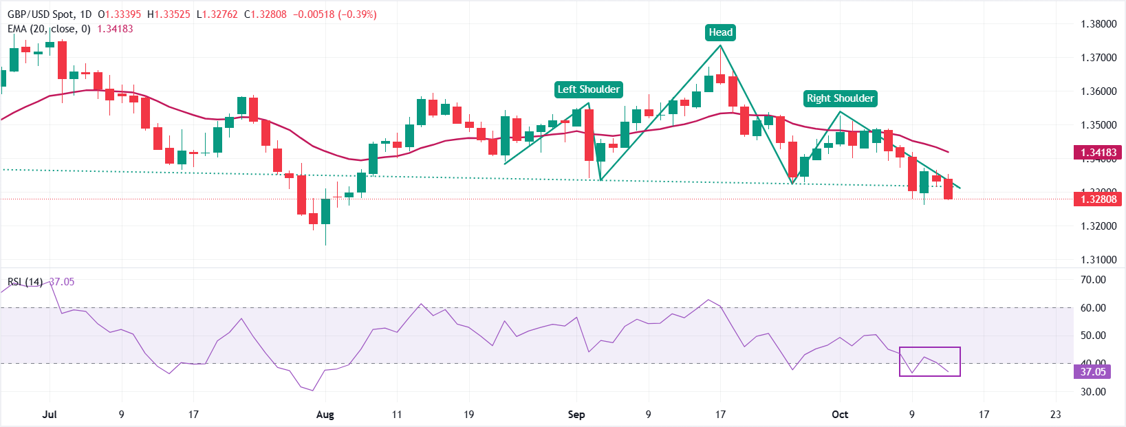 周二,英镑兑美元(USD)跌破1.3300。英镑/美元的前景已转為看跌,因為其在日缐图上突破了头肩顶(H&S)形态。