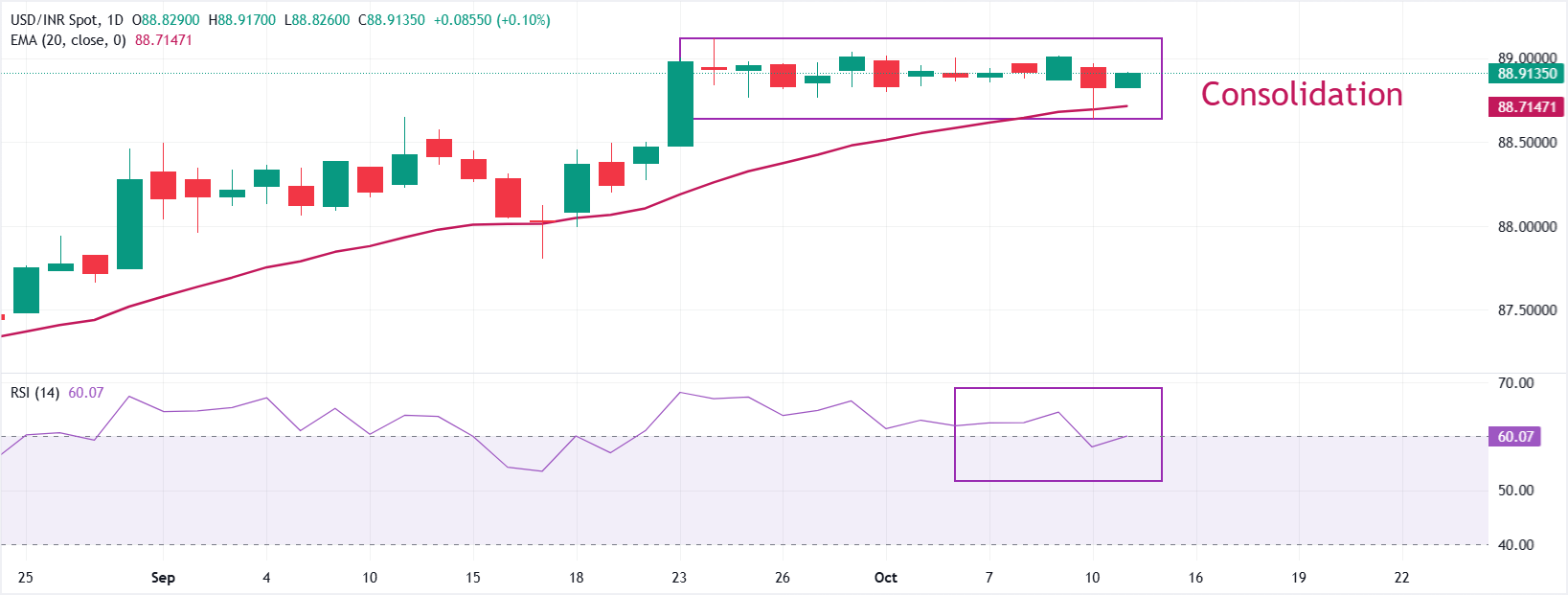 印度卢比在过去近20天内持续维持在对美元的历史低点约89.10附近。该货币对的短期趋势仍然看涨,20日指数移动均缐(EMA)在88.71附近向上倾斜。