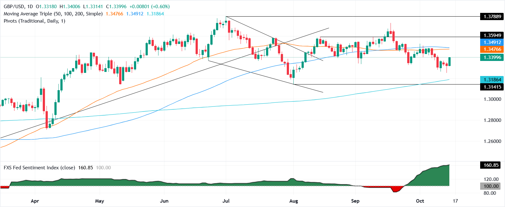 英镑(GBP)在周三北美时段回升,兑美元(USD)上涨0.60%,因中美紧张局势因美国财长斯科特·贝森特的言论而缓解。截至发稿时,英镑/美元交投于1.3396,反弹自日低1.3309。