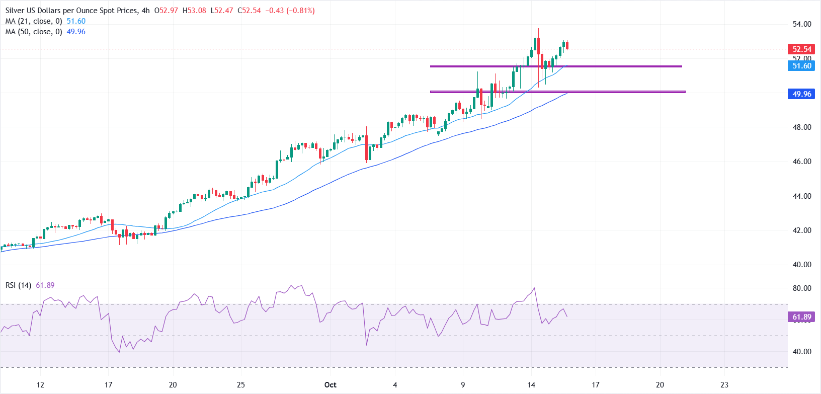 白银价格预测:随著RSI回落,白银/美元多头捍卫上行趋势,关注突破至53.77美元以上