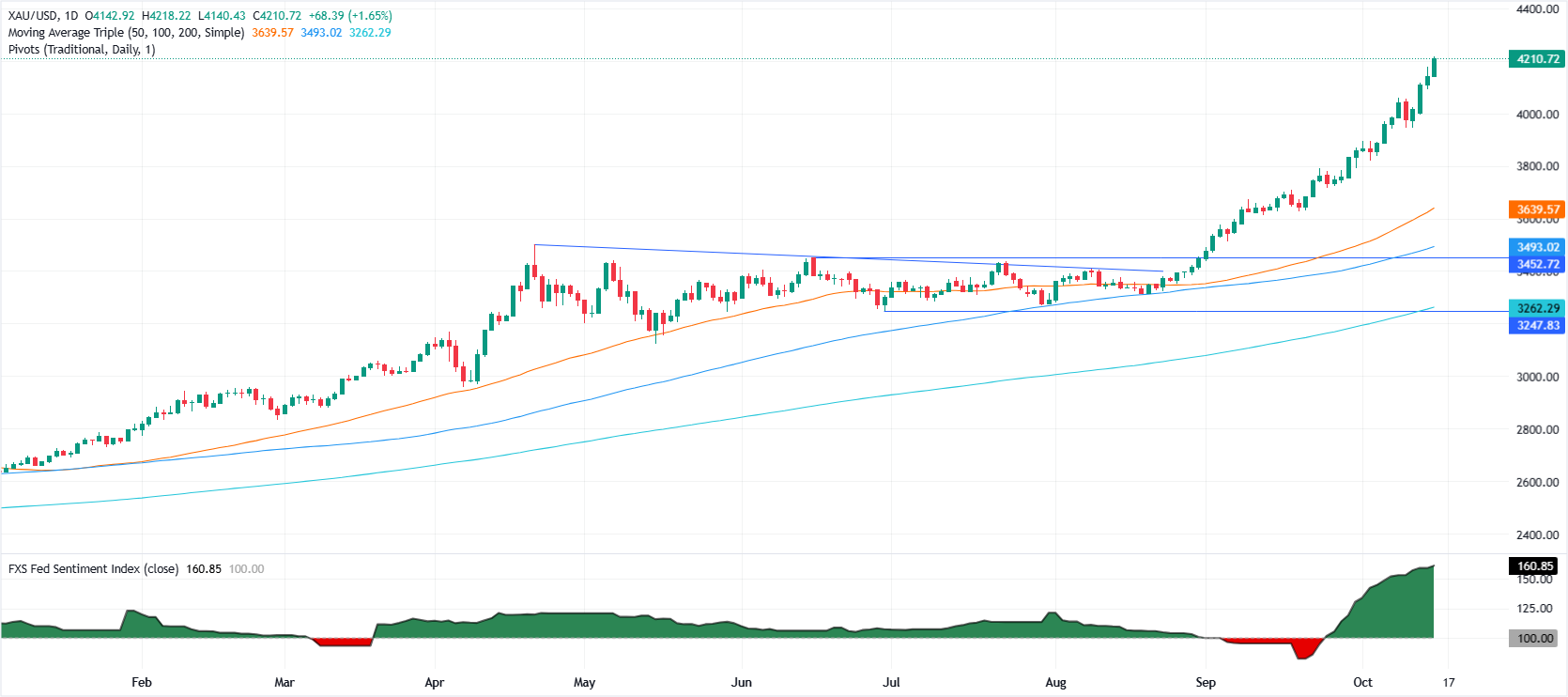 黄金保持看涨偏向,即使在4218美元的历史高点下方整固。动能继续偏向𧹒方,相对强弱指数(RSI)稳固在看涨区域——这表明上行压力依然强劲。