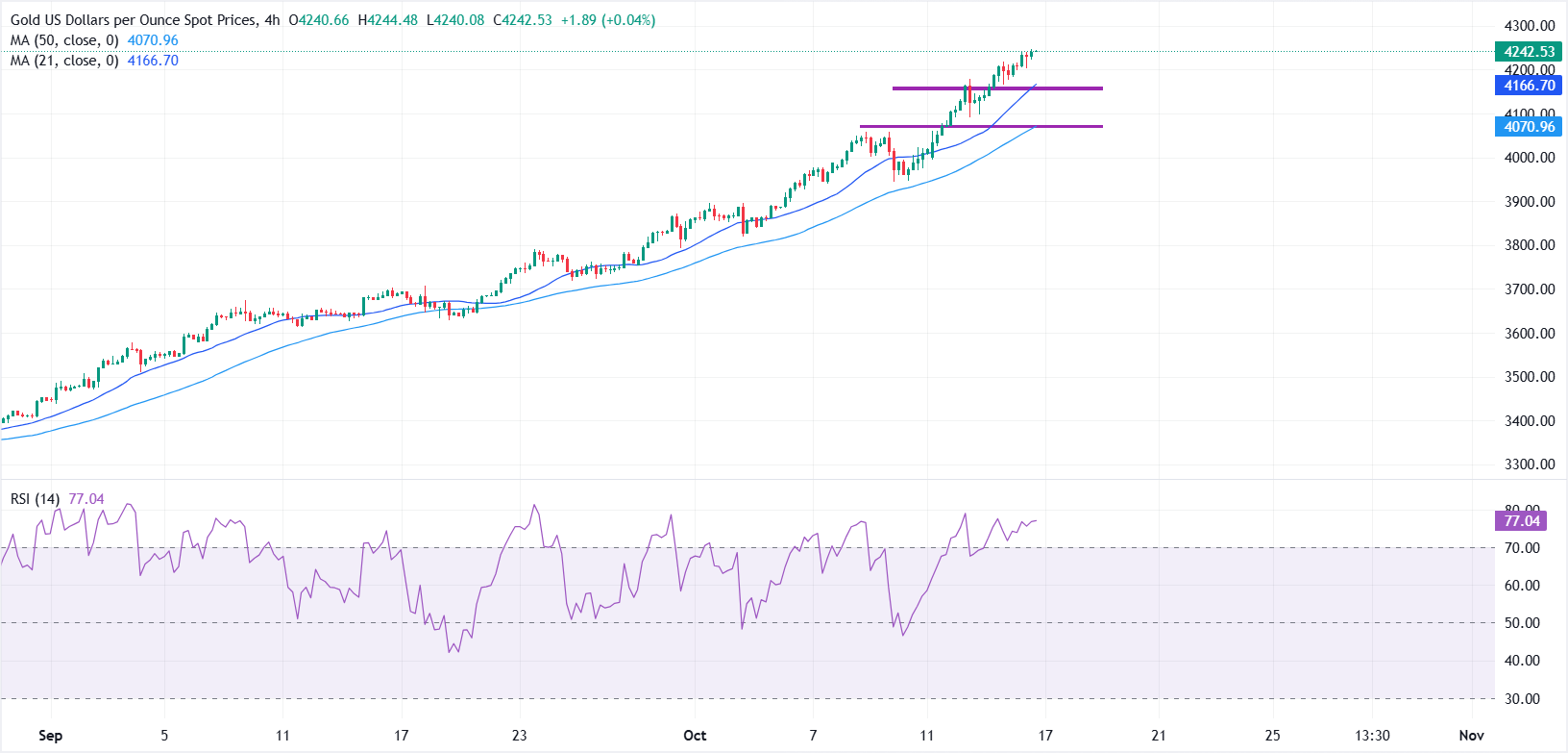 即时支撑位在4,200美元附近,标誌著日内低点,随后是4,150-4,160区域,与4小时图上的21期简单移动平均缐(SMA)重合。由于动能和趋势强度继续支持逢低𧹒入活动,向50-SMA(约4,065美元)回调的可能性在短期内看起来不大。