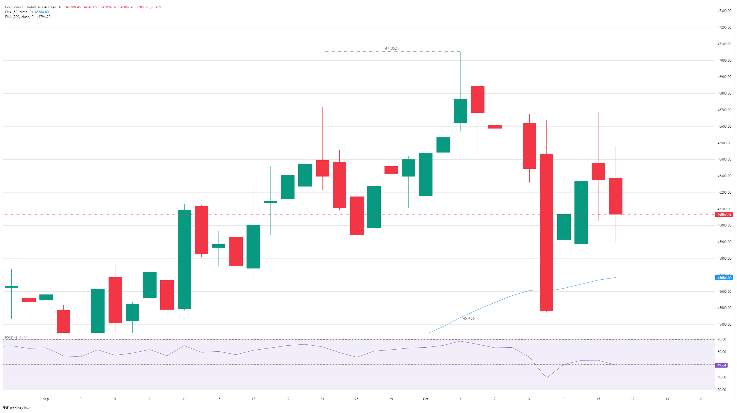 道琼斯工业平均指数(DJIA)在周四陷入加深的盘整区间,围绕46,200上下波动,最终当天下跌约330点。投资者仍然倾向于看涨,预计当前的政治和结构性问题最终会得到解决,但市场情绪持续受到冲击,裂痕不断加大。美国政府关门仍然是一个悬而未决的问题,投资者面临著风险厌恶情绪的再次袭来,因对银行资产负债表上风险贷款的担忧加剧。