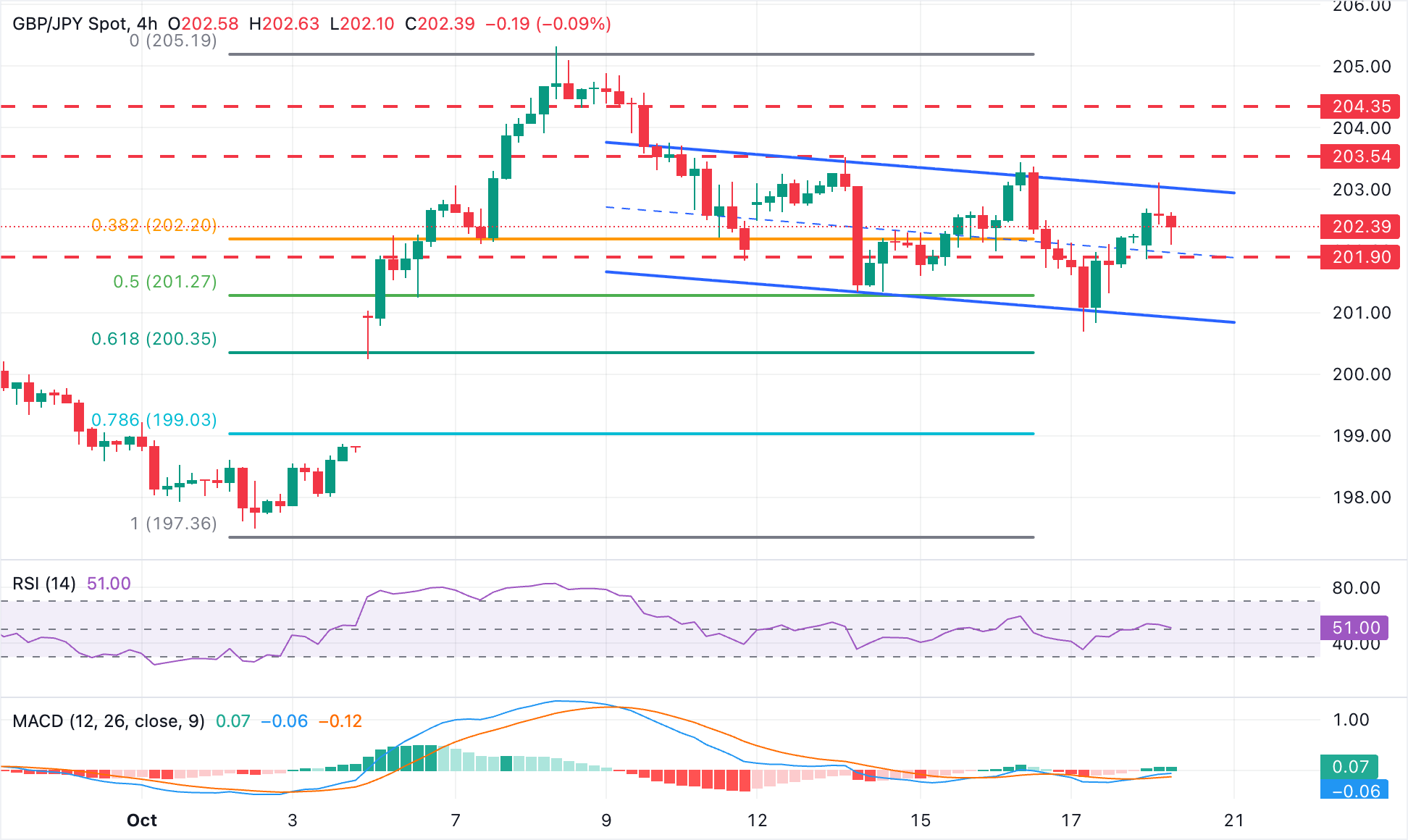 该货币对在通道顶部附近203.10受到限制,并在早期欧洲交易时段放弃涨幅,接近202.00的日内低点。通道底部的200.90区域似乎是一个可能的目标。