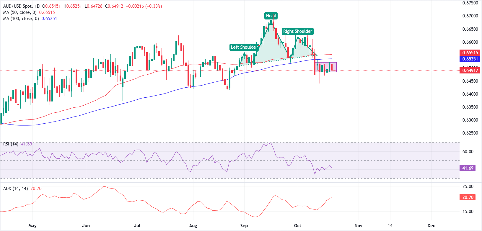 从技术角度来看,澳元/美元在确认头肩形态破位后,继续在0.6480和0.6520之间窄幅盘整。该货币对仍受限于50日和100日简单移动平均缐(SMA)下方,进一步强化了看跌偏向。