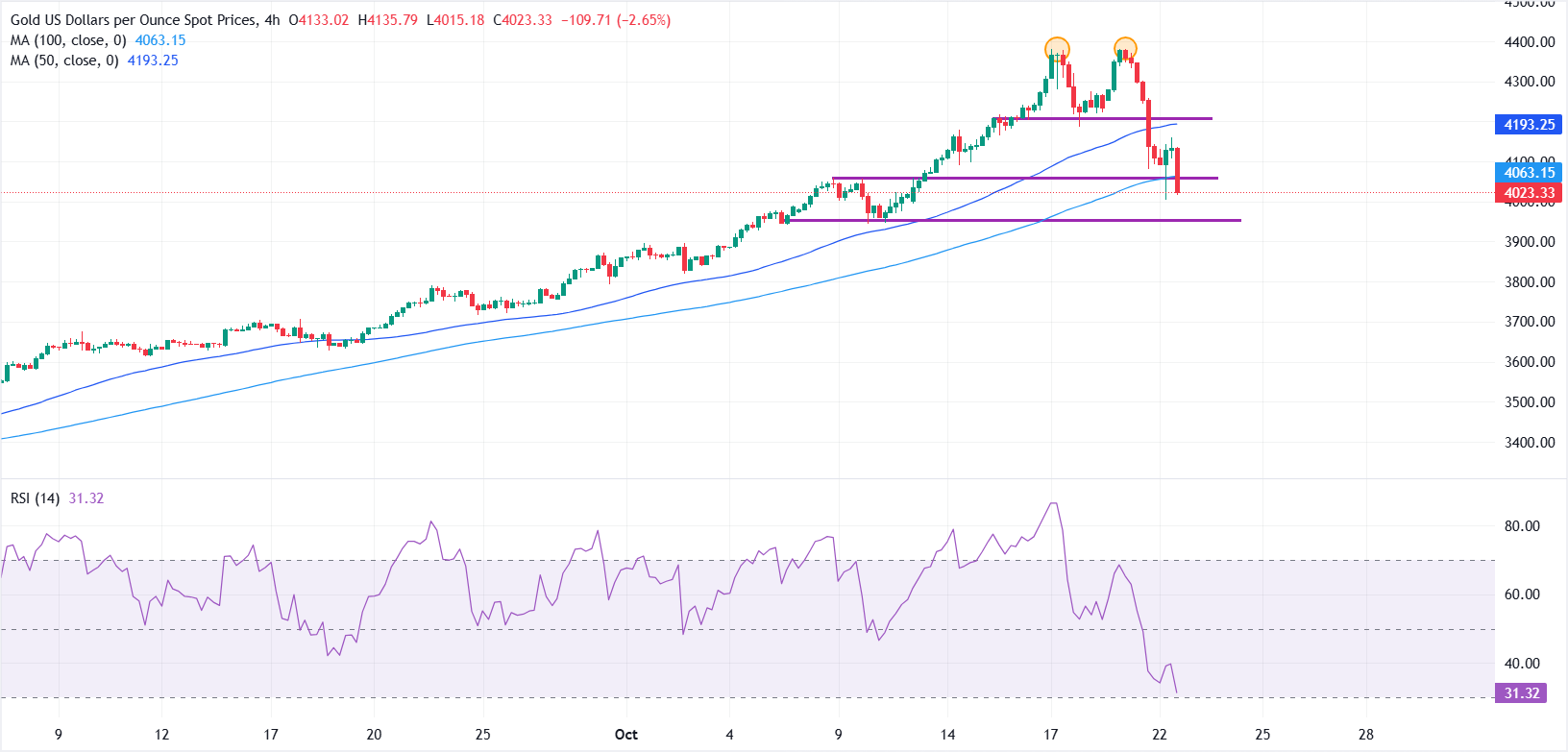 在4000美元的心理关口附近,抄底𧹒家𫔭始入场,但迄今為止的反弹仍然较為浅薄。周二,黄金遭遇自2020年8月以来最大单日跌幅,因投资者急于锁定在4380美元的过度上涨后的利润,金价暴跌超过5%。这一修正早已是时候,动能指标在最近的交易中闪现出疲软的迹象。