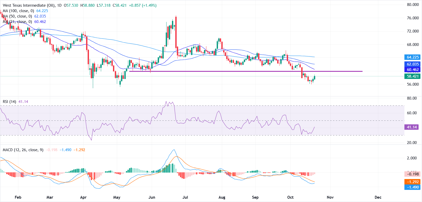 在撰写本文时,WTI 交易价格约為 58.43 美元每桶,日内上涨近 1.50%,因美元(USD)走软為价格提供了额外支持。