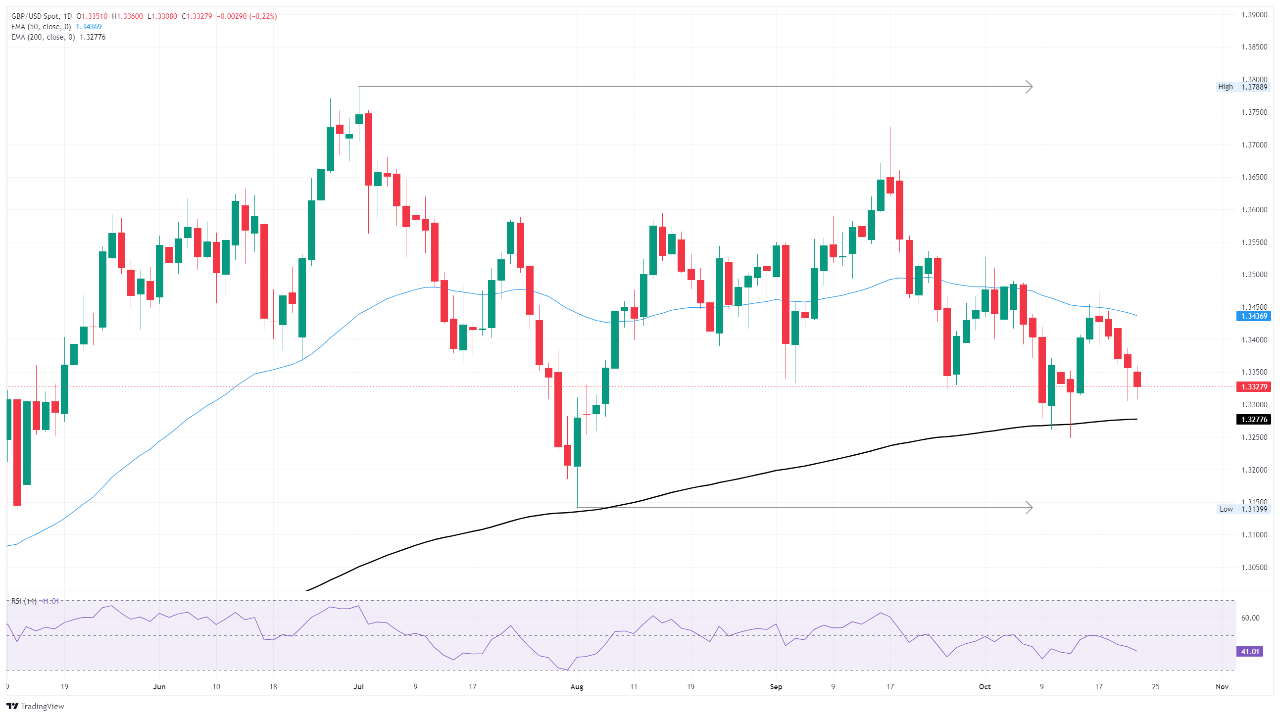 英镑/美元在周四跌入红色区域,连续第五个交易日回落,继续在1.3300关口附近试探。由于该货币对未能突破50日指数移动均缐(EMA),英镑的𧹒盘稳步下滑,但在近期盘整区间的低点获得了坚实支撑。