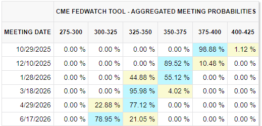 目前,观察利率的分析师仍然坚定地相信在年底前将再降息两次。根据CME的美联储观察工具,目前的降息概率显示,市场认為美联储在即将于10月29日结束的利率决策会议上维持利率不变的可能性微乎其微,仅為1%。
