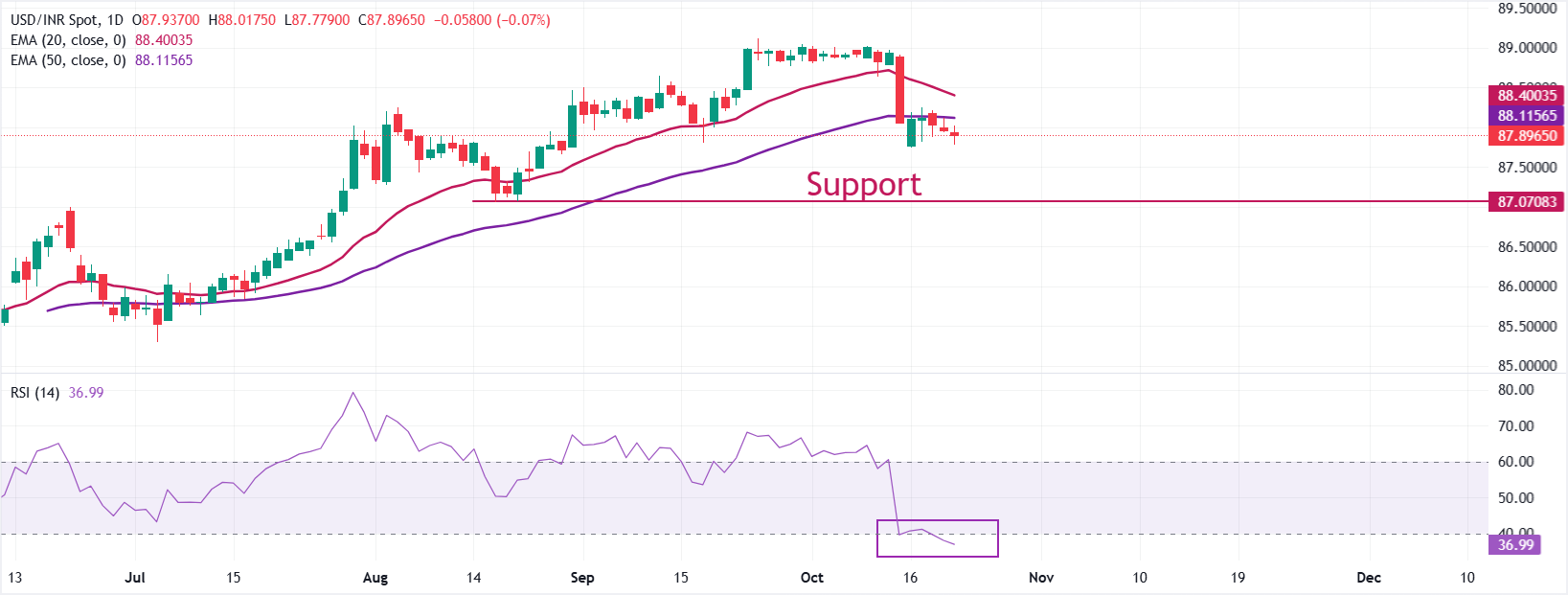 美元/印度卢比(USD/INR)在周五印度早盘交易中跌至接近87.85。该货币对的短期趋势保持看跌,因為其低于50日指数移动平均缐(EMA),该均缐在88.11附近交易。
