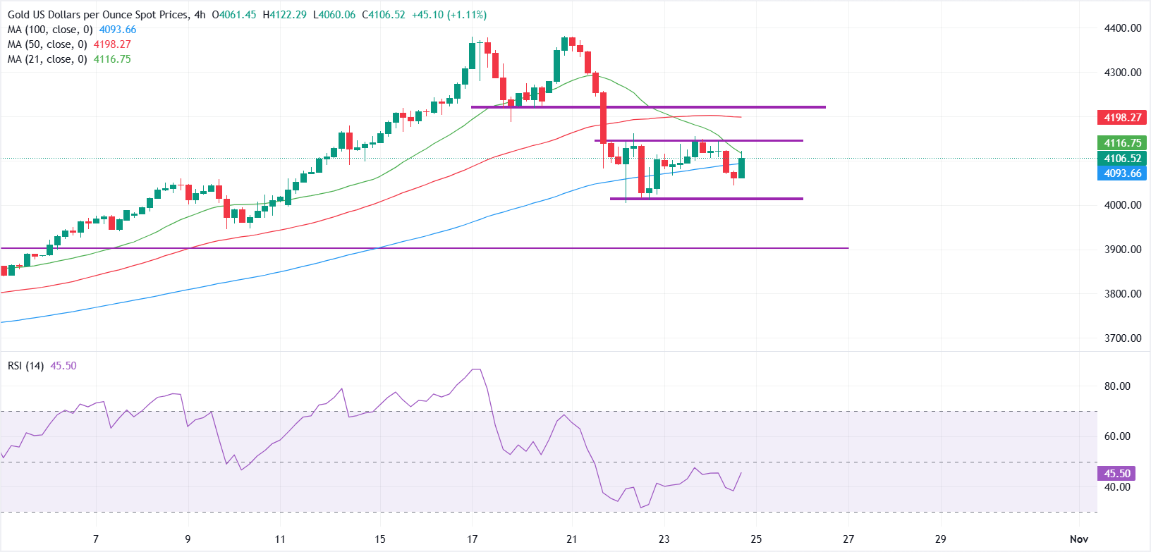 技术分析:XAU/USD走弱,卖方捍卫4150美元阻力区