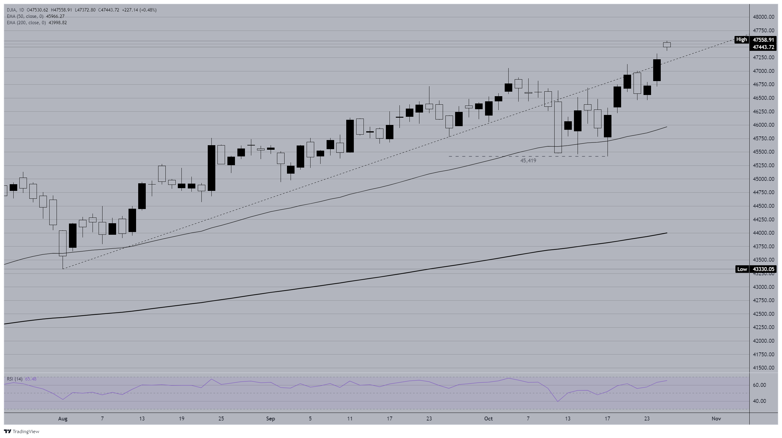 道琼斯工业平均指数(DJIA)在周一早盘交易中攀升至新的历史高点,首次突破47,500点,投资者的情绪持续恢复。市场押注美中之间的最后时刻贸易协议将避免特朗普总统威胁的关税带来的最坏结果。