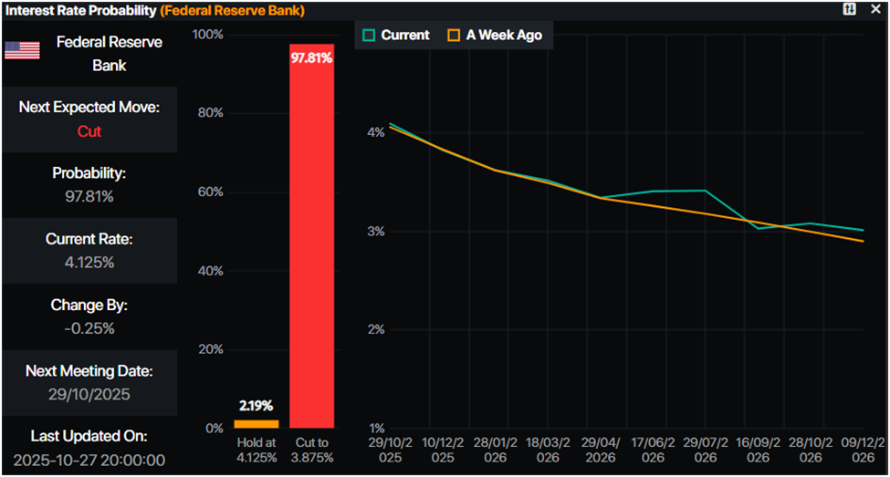 交易者预期美联储将在下次会议上降息25个基点的概率為97%,这一点通过Prime Market Terminal利率概率工具得以揭示。