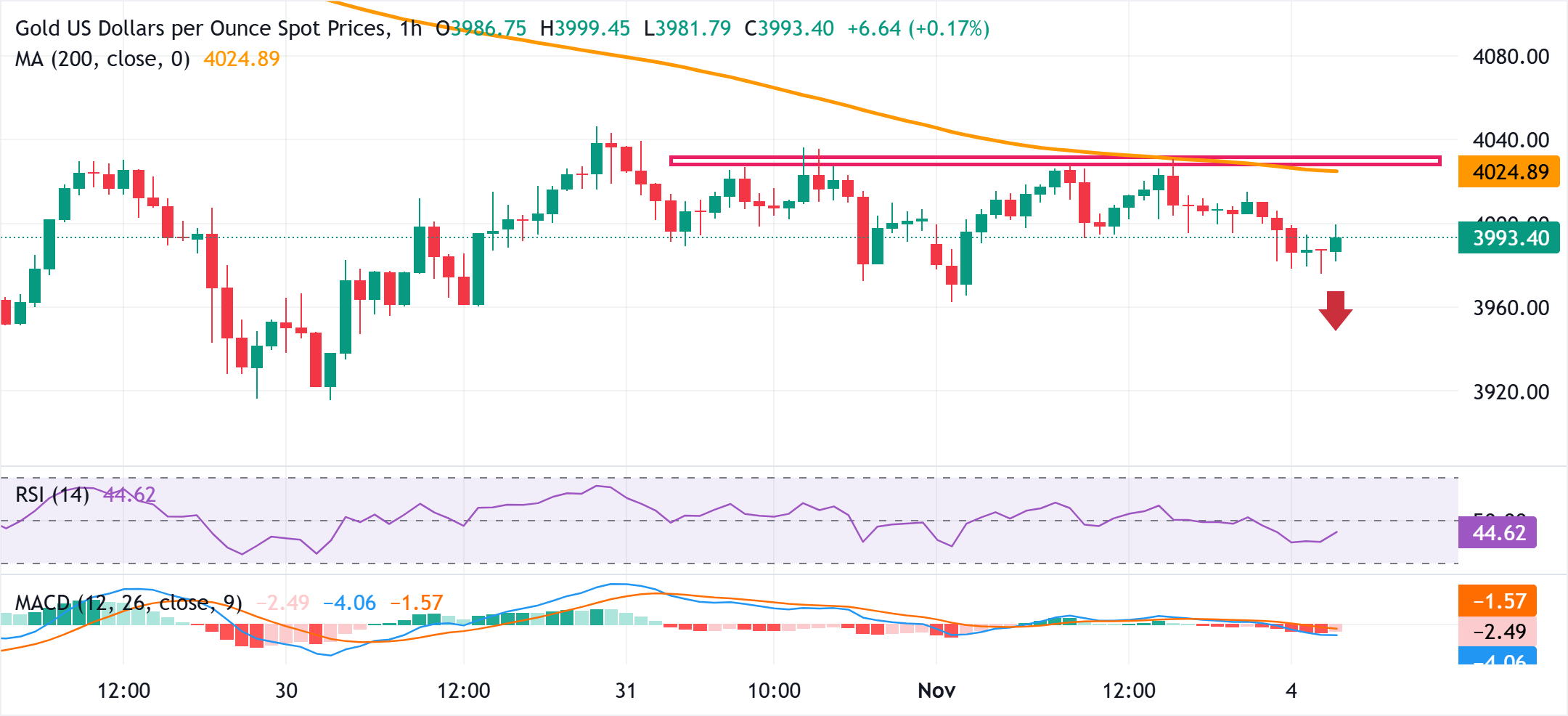 在200小时简单移动平均缐(SMA)附近的隔夜受阻和随后的回落為该商品的进一步贬值奠定了基础。然而,日缐图上的中性振盪指标使得在前一天的低点3963-3952美元区域下方等待一些后续卖盘是明智的,之后可能加速下滑至3940美元的中间支撑位,进而到达3910-3900美元区域和上周的低点3886美元。