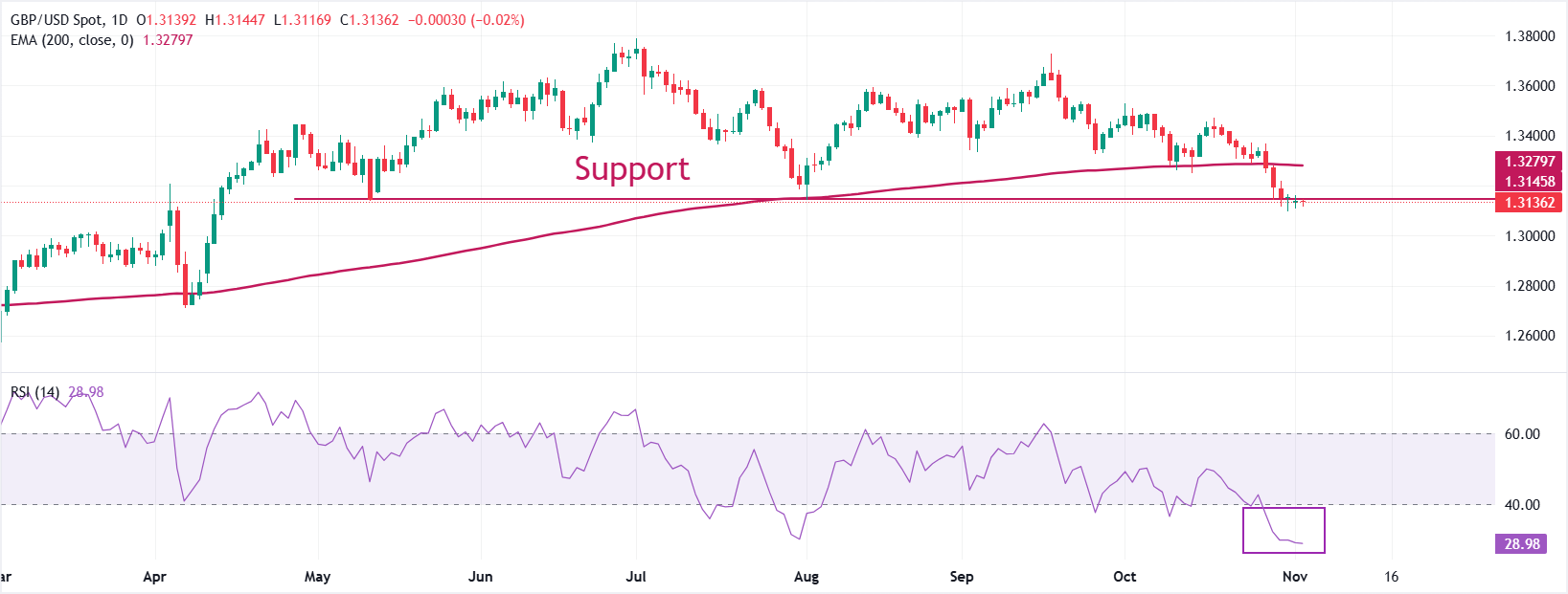 在周二的欧洲时段,英镑兑美元在1.3100上方的窄幅区间内交易。由于英镑交易低于200日指数移动平均缐(EMA),该均缐约為1.3279,前景依然看跌。