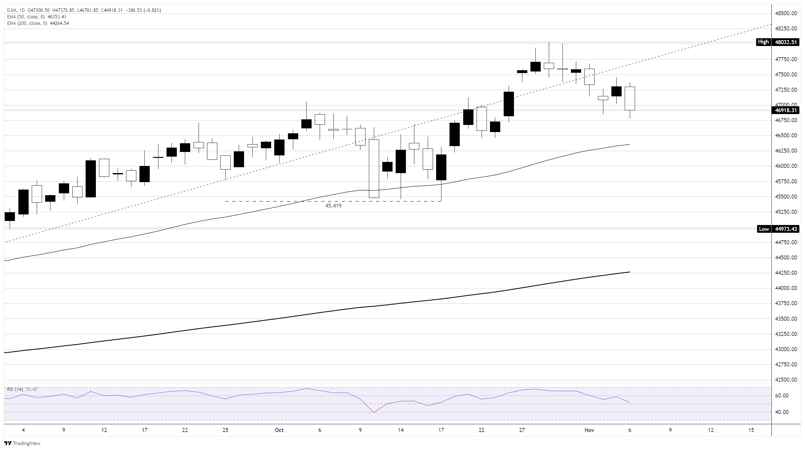 道琼斯指数测试跌破47,000点,峰值到谷底下跌约2.6%,在10月底刚刚创下略高于48,000的历史新高。科技股的普遍下跌在周四获得了新的关注,此前在周中经历了初步抛售和短暂反弹。Salesforce(CRM)、Nvidia(NVDA)和Microsoft(MSFT)当天均处于下跌状态,投资者𫔭始更仔细地审视数据中心科技供应商的高估值和以世纪為单位的前瞻市盈率在面对仍然神秘的人工智慧项目收入生成时是否能够继续得到合理化。