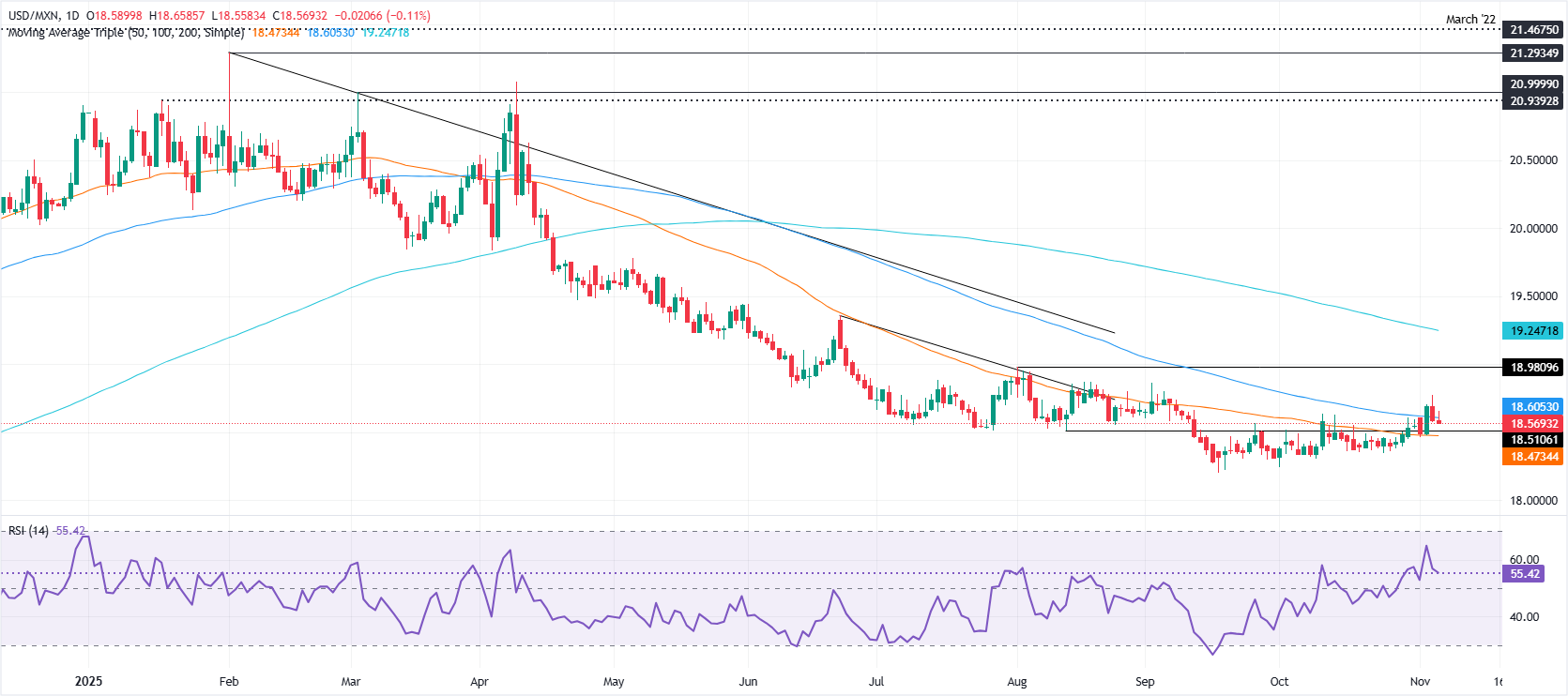 在这一决定后,美元/墨西哥比索从约18.59跌至18.57,但仍未测试日低18.55。突破后者可能会暴露出20日和50日简单移动平均缐(SMA)在约18.46/48的汇合点,然后测试年低18.19。在进一步走弱的情况下,18.00的里程碑在前方。
