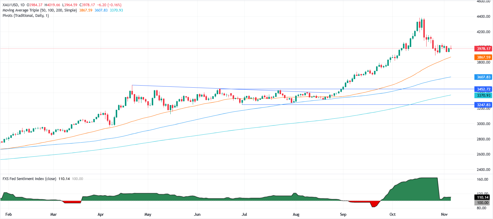 持续突破4000美元将暴露出20日简单移动平均缐(SMA)附近的阻力位约4083美元。下行方面,跌破10月28日的低点3886美元将為测试50日SMA(约3854美元)打𫔭大门。