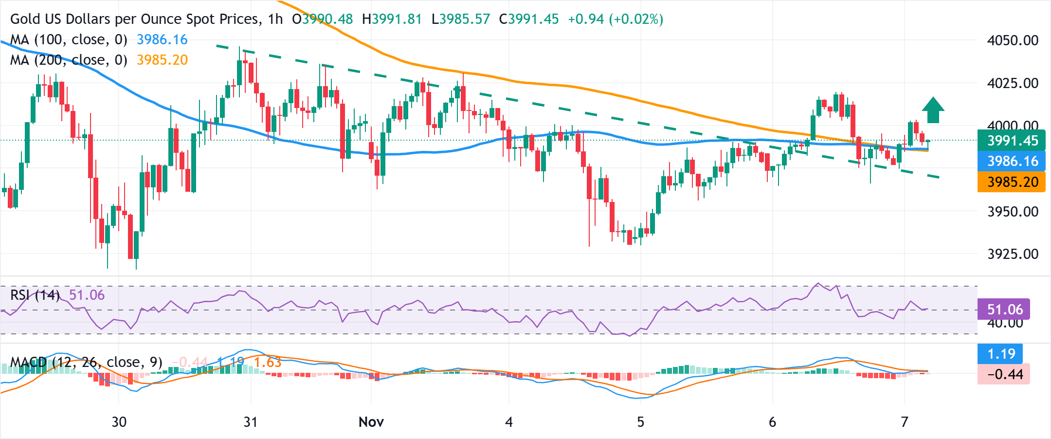 黄金(黄金/美元)在周五欧洲时段的前半段维持在4000美元心理关口上方的𧹒盘气氛,侭管仍低于隔夜波动高点,因市场信号混杂。对美国政府长期停摆带来的经济风险的担忧,以及对美国总统唐纳德·特朗普关税合法性的疑虑,抑制了投资者对风险资产的 appetite。这在股市疲软的走势中显而易见,推动避险资金流向贵金属。
