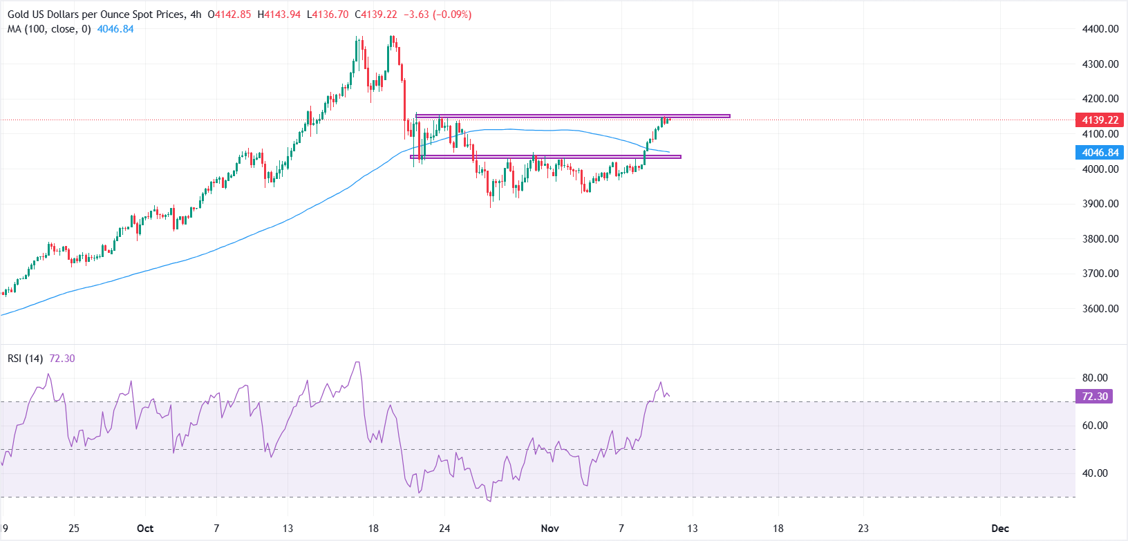 技术分析:黄金/美元在看涨突破后在4150美元下方盘整