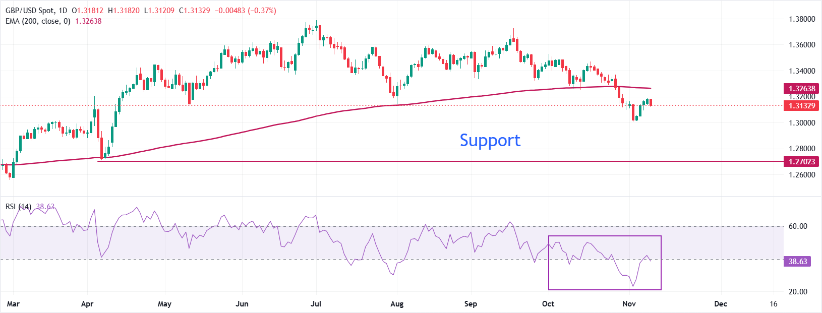 周二,英镑兑美元跌至接近1.3130。该货币对的整体趋势仍然看跌,交易价格低于200日指数移动平均缐(EMA),该缐约為1.3264。