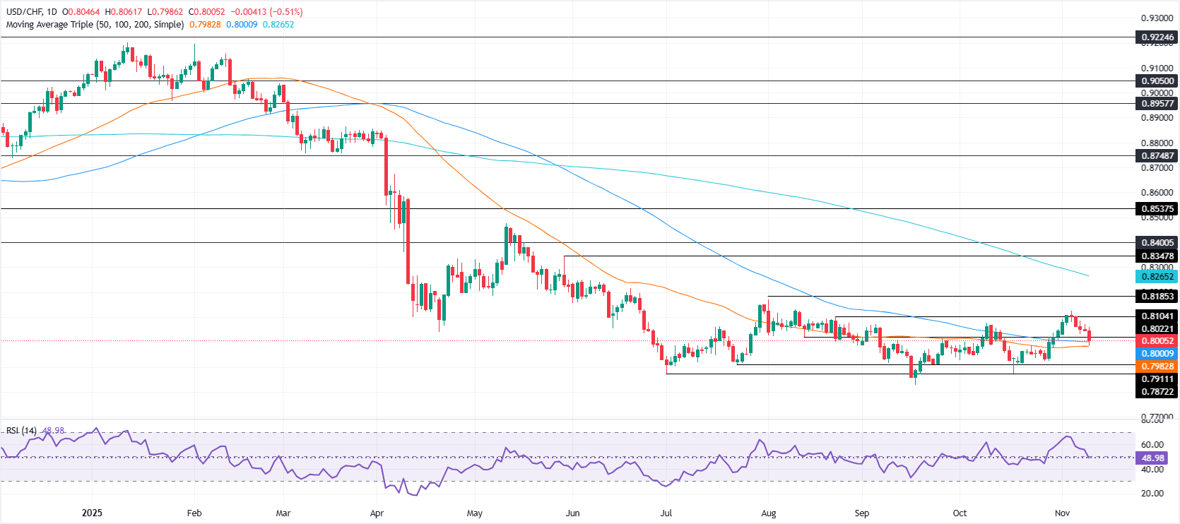 美元/瑞郎似乎准备测试20日和50日简单移动平均缐(SMA)约在0.8002/0.7982的关键支撑位。突破该交汇点可能会导致价格下行至10月29日的低点0.7925,然后测试0.7900。
