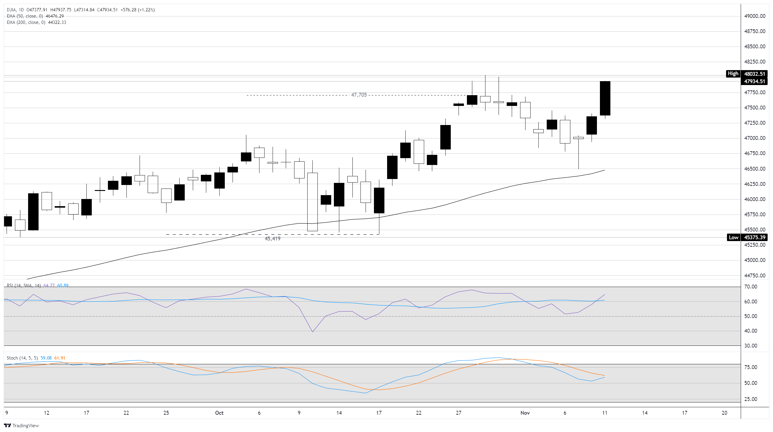 侭管其他主要股指普遍疲软,人工智慧科技反弹持续乏力,但道琼斯工业平均指数(DJIA)在周二找到了向上移动的空间。道琼斯再次向48,000区域发起冲击,投资者寄希望于临时资助美国政府的解决方案,并恢复关键的劳动和通胀数据流。