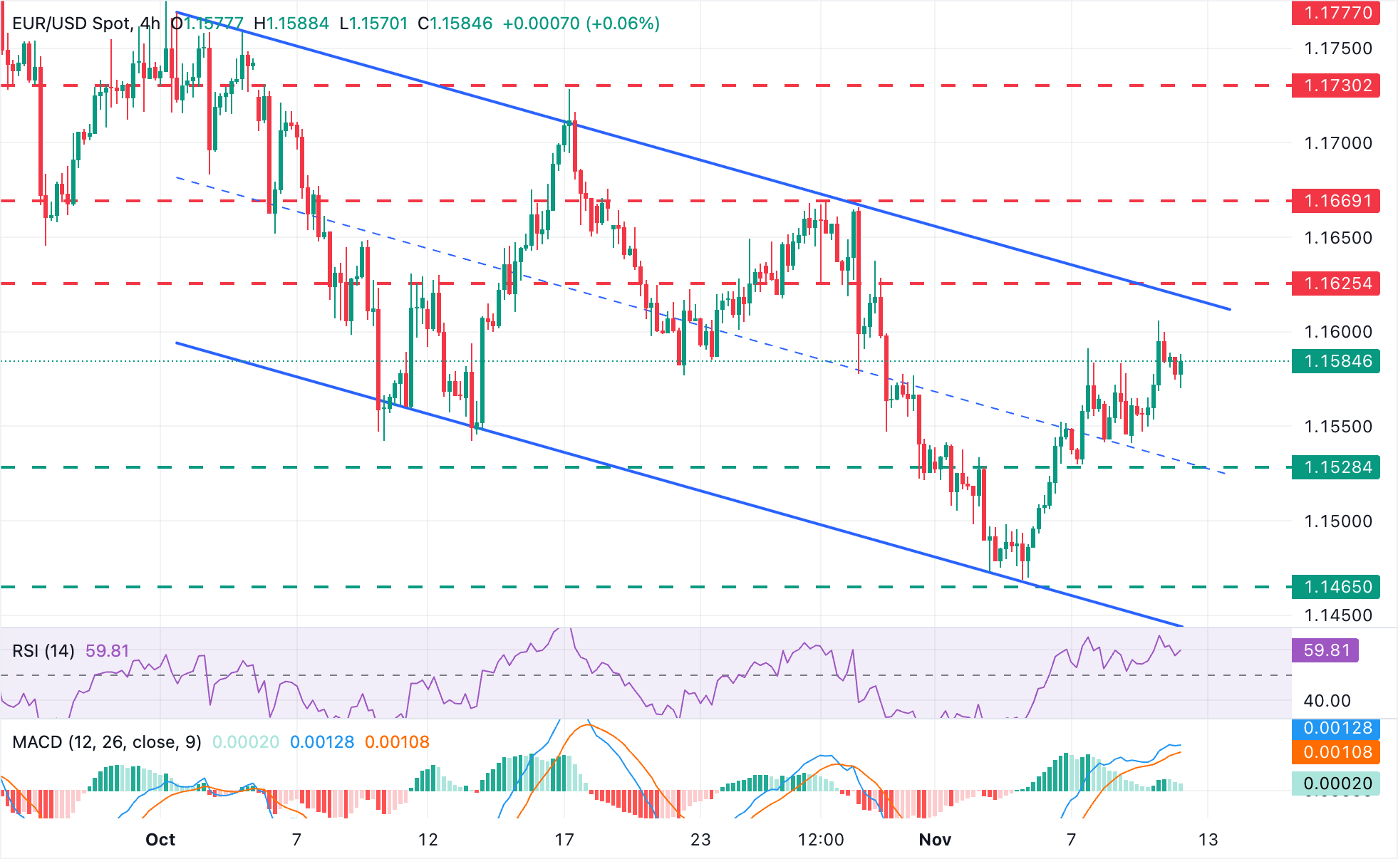 价格走势接近自10月初高点以来的下降通道顶部,目前约在1.1615,这将与之前的支撑位相遇,位于1.1620-1.1625区域(10月28日低点)。该货币对若突破这些水平将取消更广泛的看跌趋势,并将焦点转向10月28日和29日接近1.1670的高点。