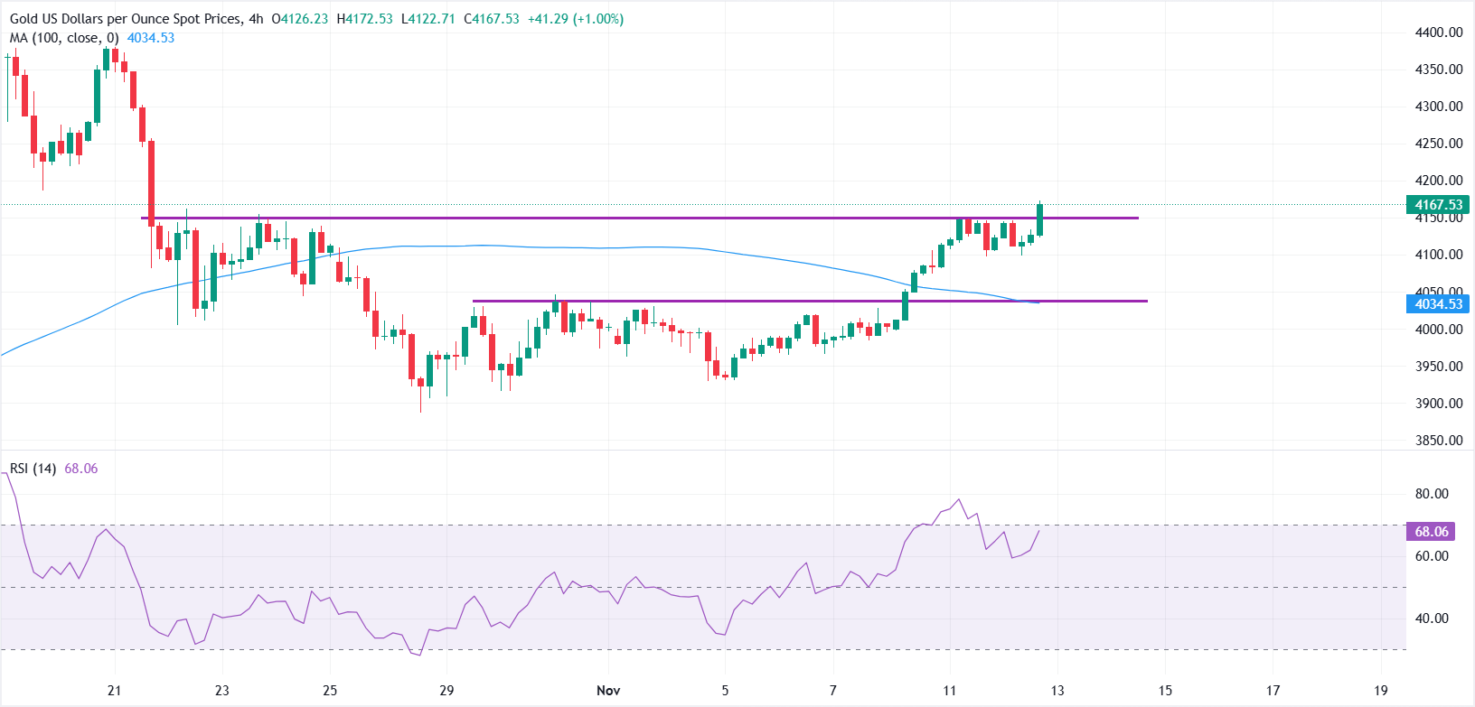 黄金(黄金/美元)在周三恢复了强势,此前大部分时间处于盘整状态,随著投资者在美国国会即将进行的关键投票以结束创纪录的政府停摆前保持谨慎,价格小幅上涨。截至撰写时,黄金/美元交易在4170美元附近,日内上涨近1.0%。