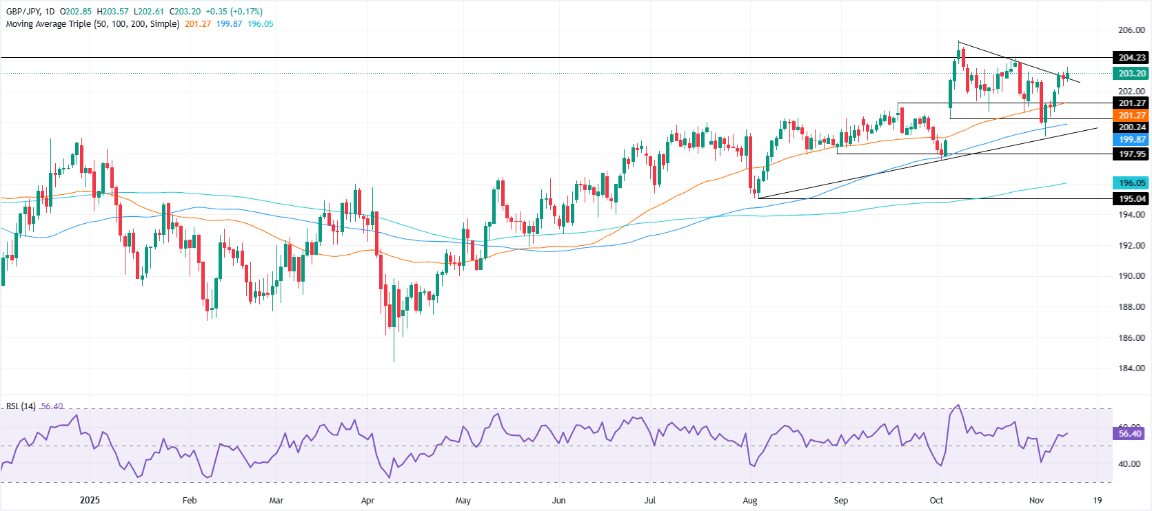 - 相对强弱指数(RSI)指向持续的上行偏向,但若跌破202.45可能会暴露201.35的支撑区。