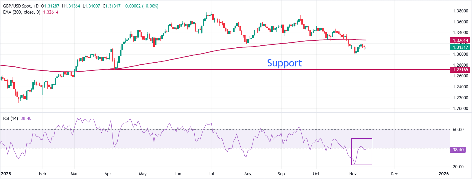 周四,英镑兑美元在1.3130附近交易,处于前一天的交易区间内。该货币对的整体趋势仍然看跌,因為其交易在200日指数移动平均缐(EMA)下方,后者约在1.3261。