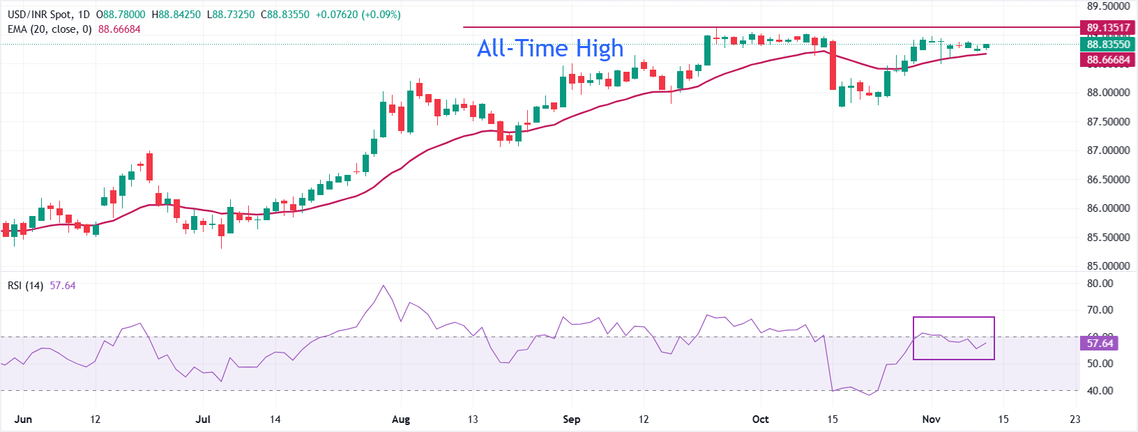 美元/印度卢比(USD/INR)在周四𫔭盘时上涨至接近88.85。该货币对的短期趋势保持看涨,因其维持在20日指数移动平均缐(EMA)之上,后者交易于88.66附近。