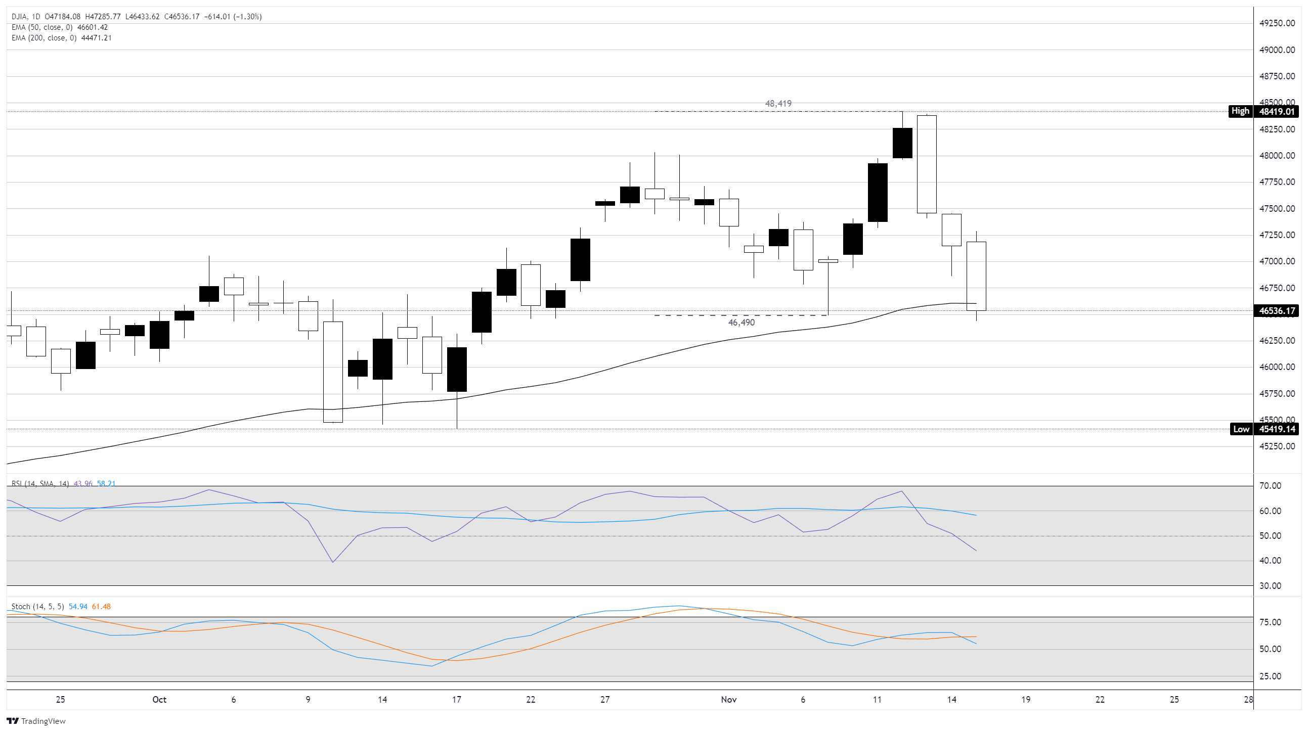 道琼斯工业平均指数因对人工智慧的担忧和美联储的不确定性跌破47,000点
