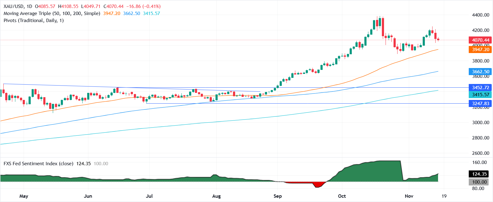 然而,未能维持在4050美元上方将使黄金面临下跌至4000美元的风险,之后可能挑𢧐10月28日接近3886美元的低点。