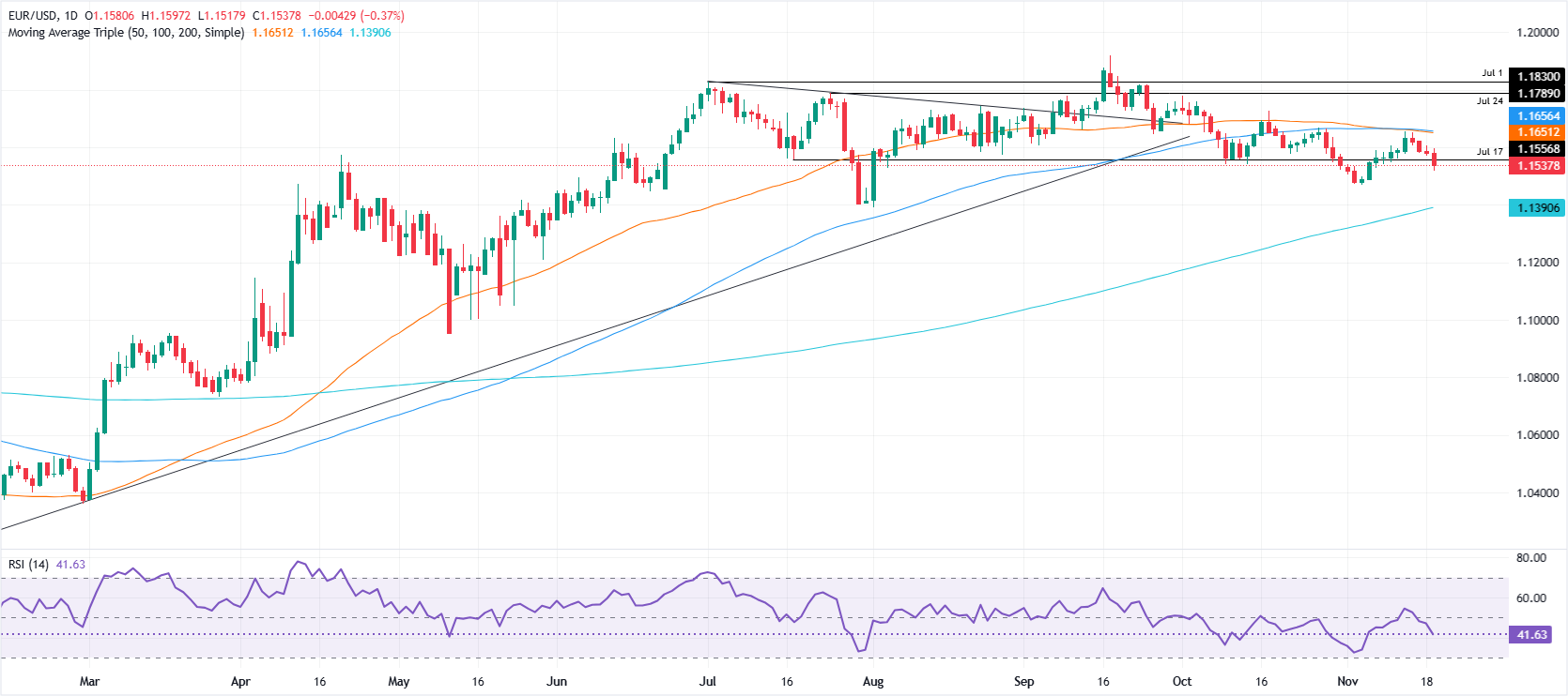 根据10月份的会议纪要,欧元/美元周三下跌超过0.49%,因美联储暗示可能在12月会议上跳过降息。该货币对交易于1.1524,曾触及接近1.1600的日低。