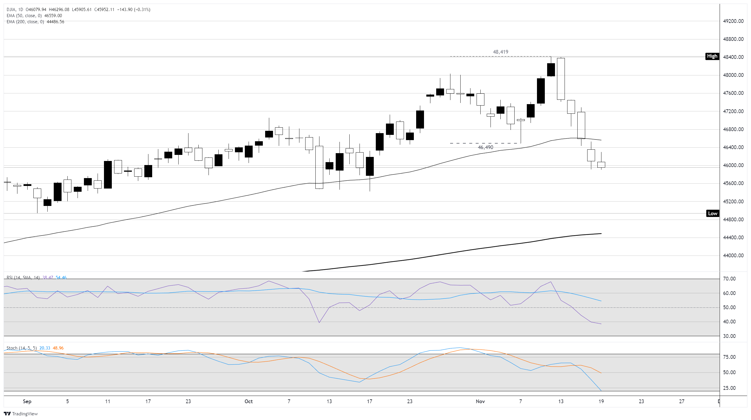 道琼斯工业平均指数(DJIA)周三在46000这一主要价格关口附近挣扎,几乎持平,处于下行轨迹中。道琼斯连续四个交易日下跌,较接近48420的历史高点下跌近5%,但关键平均股的卖压可能已经过度,过快。