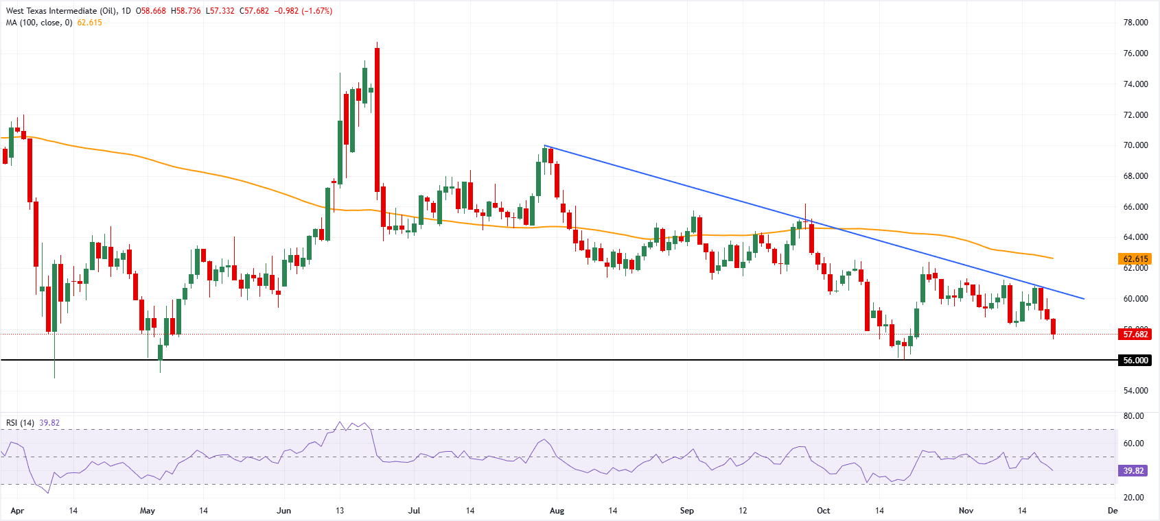 在日缐图中,WTI美国原油交易价格為57.68美元。100日简单移动平均缐(SMA)继续向下倾斜,价格保持在其下方,维持看跌偏向。相对强弱指数(RSI)降至39.82,低于50中缐,表明动能疲软。水平缐在56.00美元附近提供支撑,跌破该水平将暴露进一步下行空间。