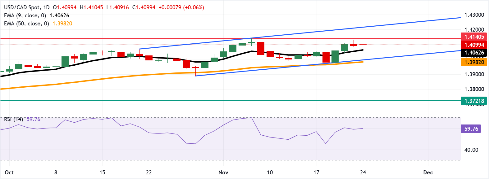 美元/加元在周一早盘欧洲时段恢复了前一交易日的近期损失,交易价格在1.4100附近。日缐图的技术设置反映出持续的看涨偏向,该货币对仍在其上升通道模式内。14日相对强弱指数(RSI)在59.9附近上升,保持在中缐之上,确认了看涨动能。