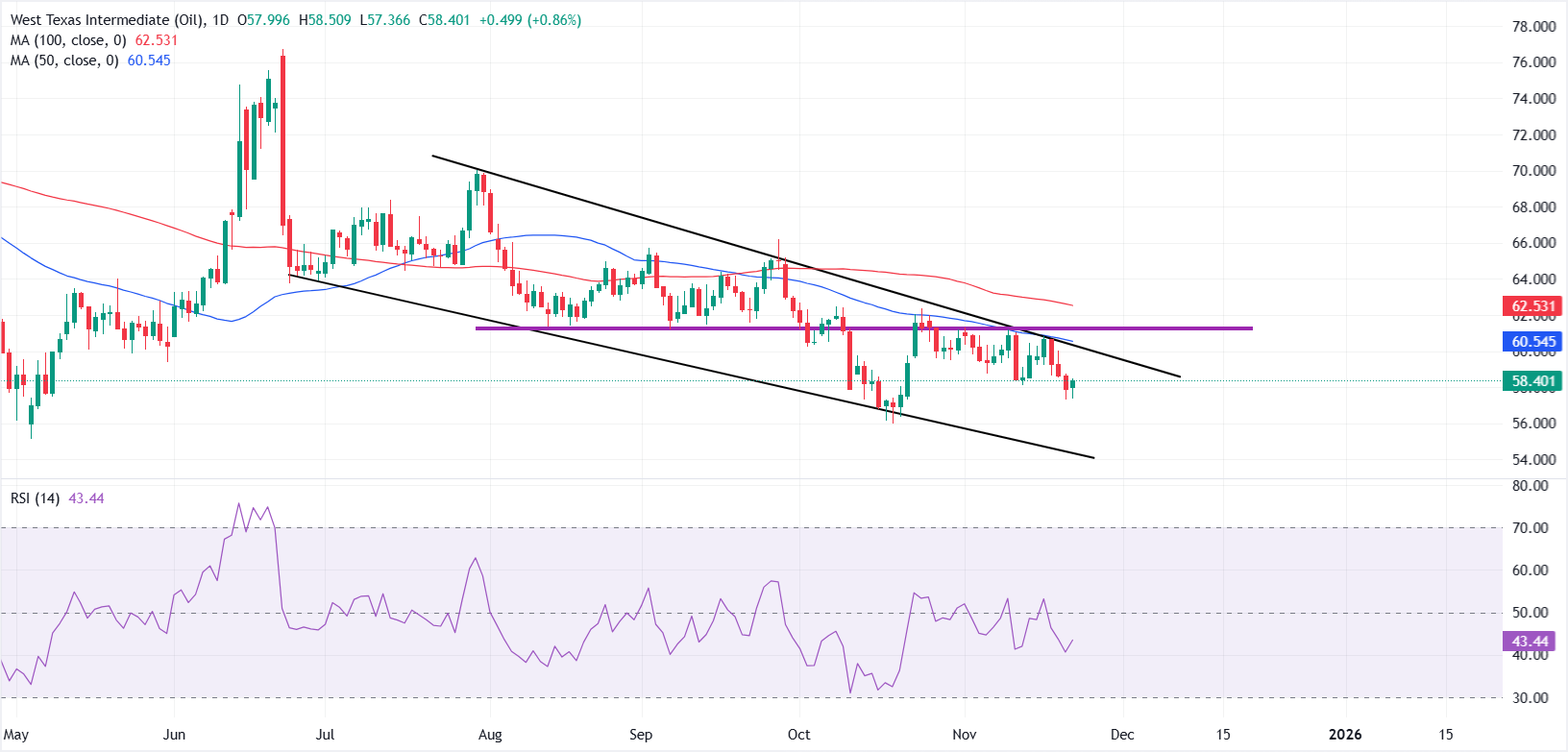 从技术角度来看,WTI仍然被限制在日缐图上一个明确的向下平行通道内,特征是低高点和低低点的序列,使得整体前景偏向下行。价格继续在50日和100日简单移动平均缐(SMA)下方交易,强化了看跌的结构性偏向。