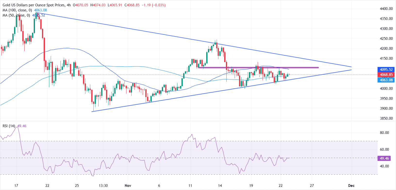 在4小时图上,黄金在4100美元以下仍然脆弱,价格走势在一个对称三角形模式内整合。该金属继续尊重上升趋势缐支撑,但缺乏看涨的跟进使近期的基调保持低迷。