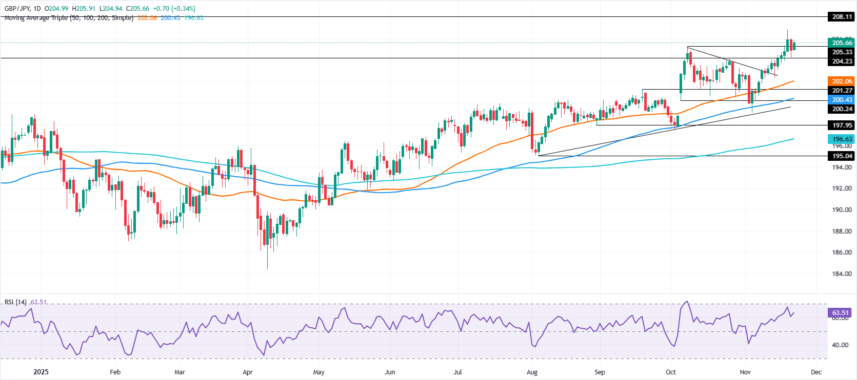 - 相对强弱指数(RSI)信号显示出看涨动能,随著货币对保持在205.00以上,向上趋势受到青睐。