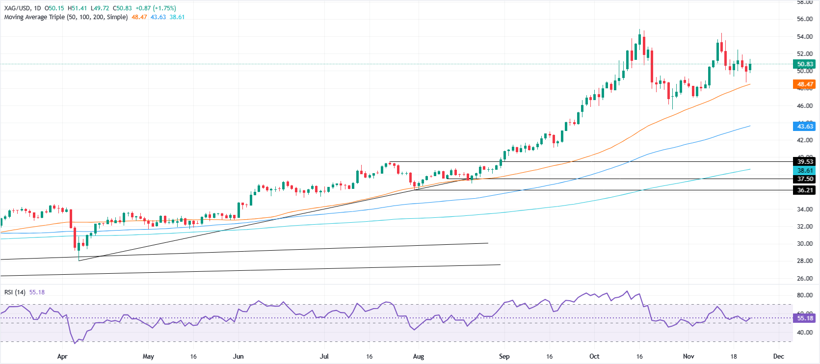 白银(XAG/USD)在北美交易时段大幅反弹,反弹幅度超过2.50%,从日低49.73美元反弹,目前交易于51.37美元。市场预期美联储可能在12月放鬆政策,推动美国国债收益率下降,為无收益金属提供了顺风。