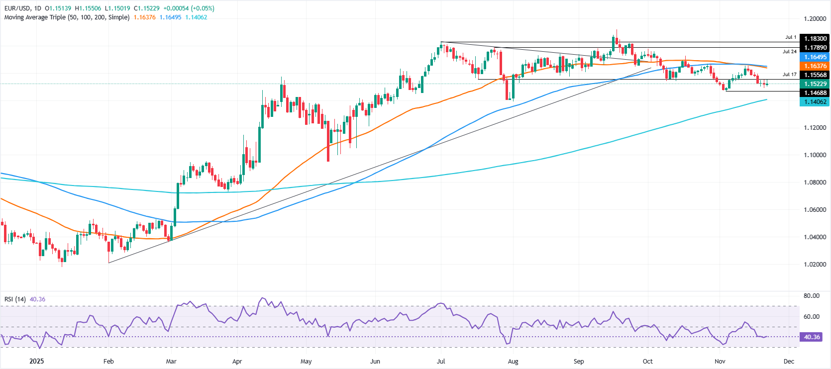 相反,若跌破1.1500,将為挑𢧐11月5日的低点1.1468和接近1.1409的200日简单移动平均缐(SMA)铺平道路。