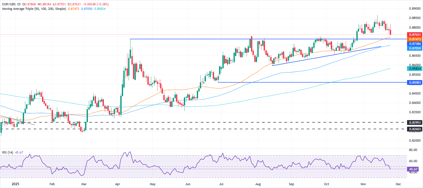 欧元/英镑在周三回落,此前英国财政大臣瑞秋·里夫斯(Rachel Reeves)公布的最新预算似乎受到投资者的好评,最初导致英镑(GBP)抛售,削减了早期的损失。截至发稿时,该货币对交易于0.8766,下降0.24%。