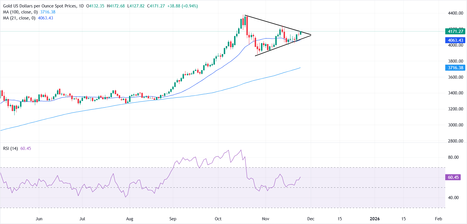 黄金(黄金/美元)在周三保持坚挺,交易者倾向于更加鸽派的美联储(Fed)前景,黄金/美元在约4150美元交易,稍微回落,此前在当天早些时候攀升至两周高点4173美元附近。